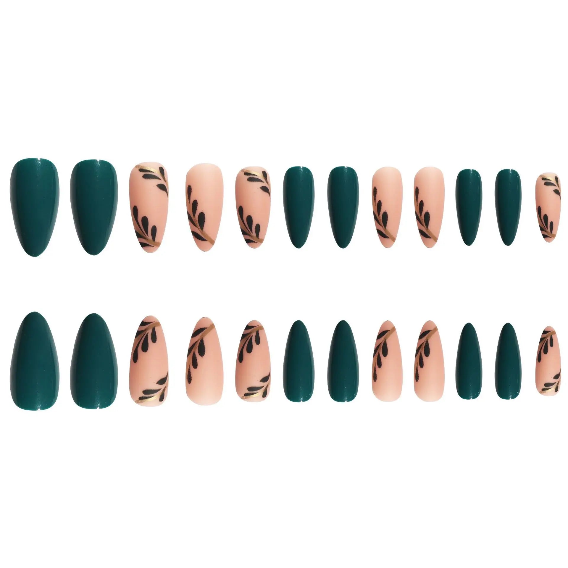24pcs/box Women Long Almond Shaped False Nails Green Leaves Diy Fake Nail Artificial