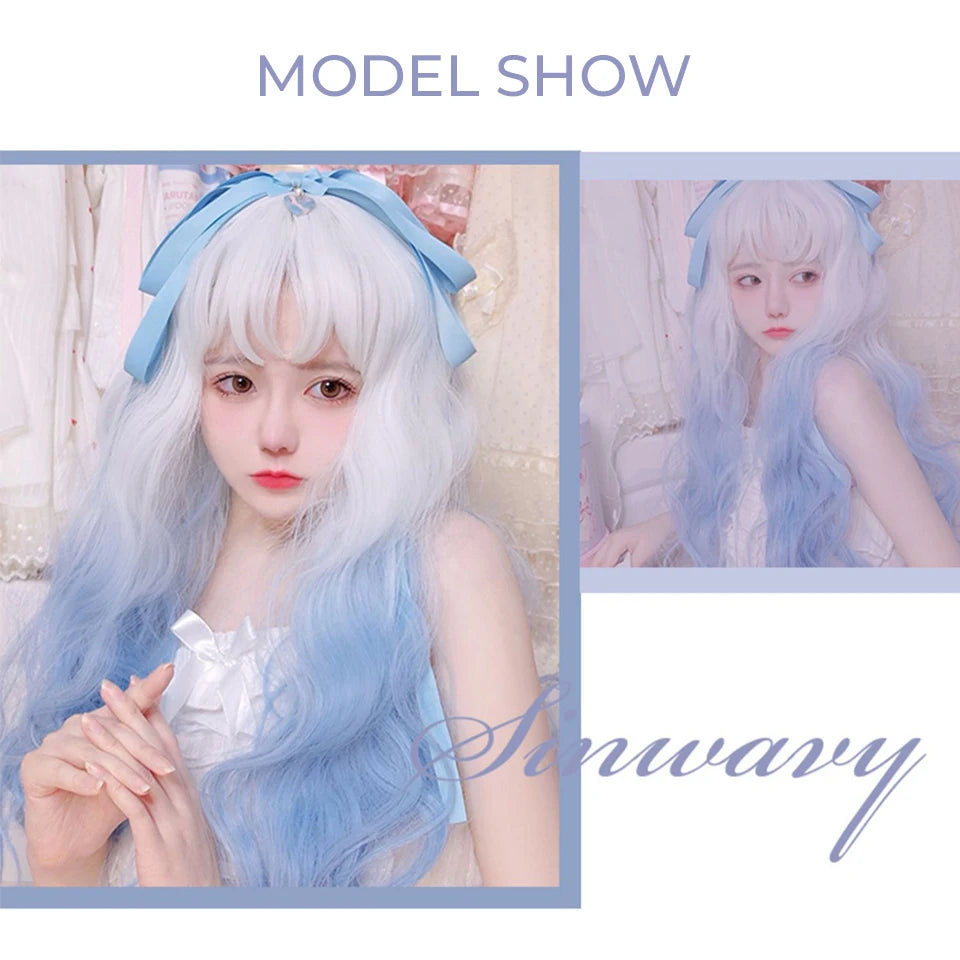 Long Curly Wave Wig with Bangs Blonde Biue Colorful Cosplay Wig for Women